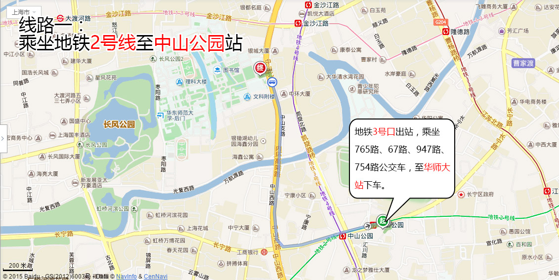 乘地铁3、4、13号线,至金沙江路站(5号出口)。